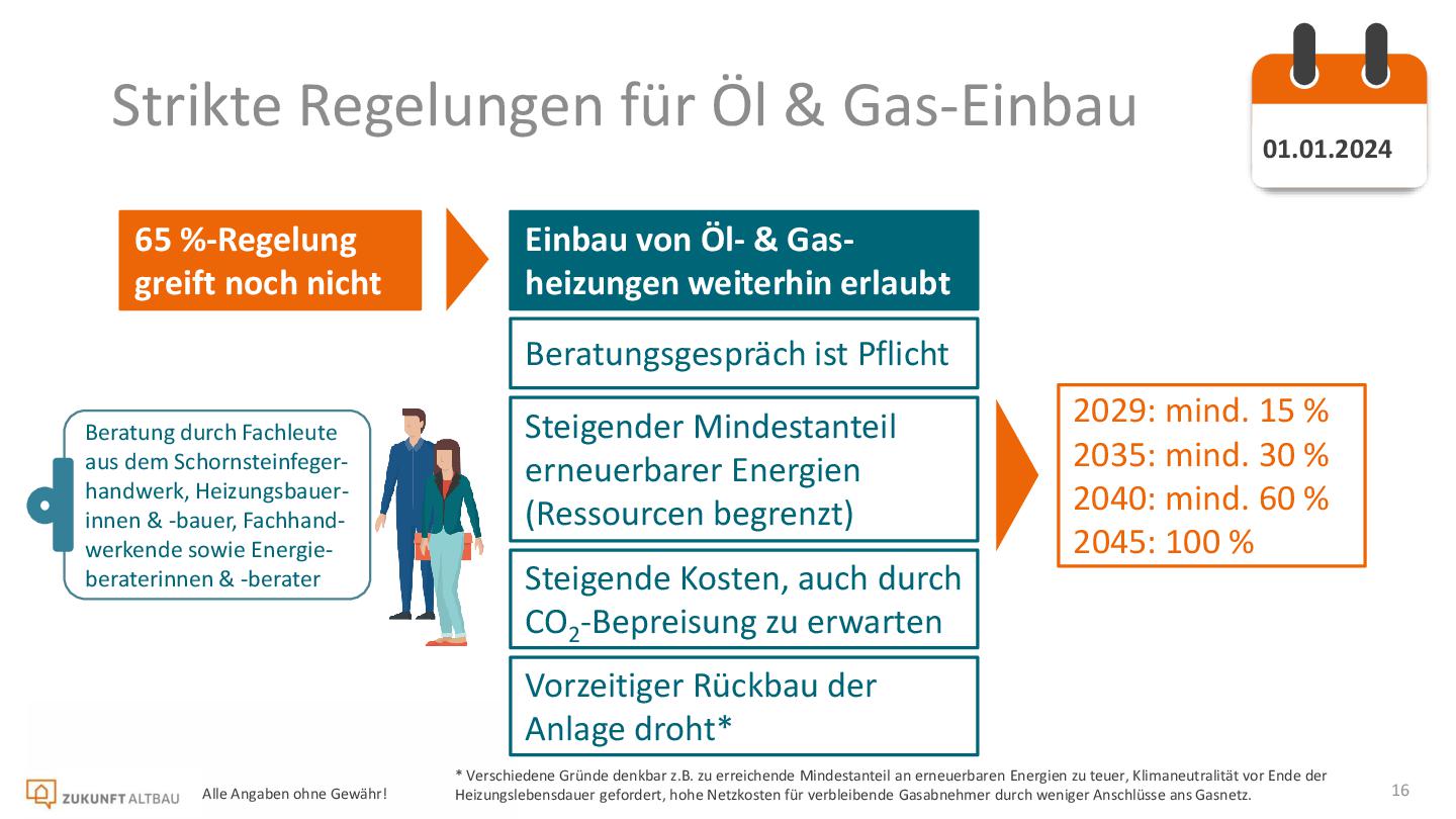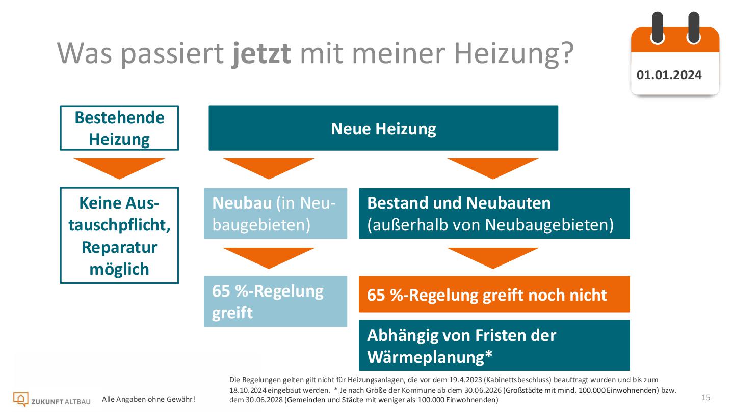 Wichtig: Es geht nur um den Einbau oder das Aufstellen neuer Heizungen. Bereits eingebaute Heizungen können weiter betrieben und defekte Heizungen können weiterhin repariert werden.