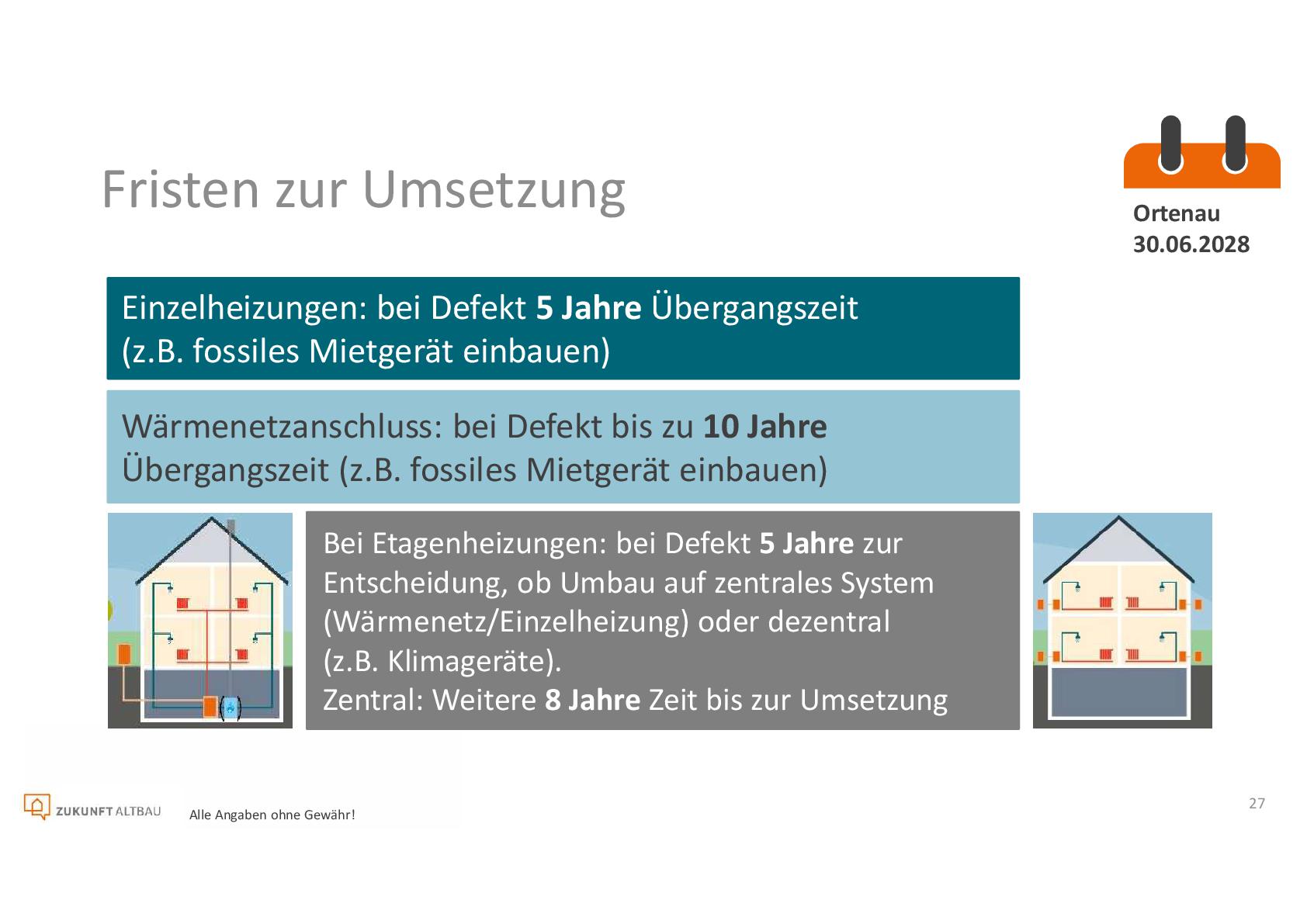 Für bestehende Gebäude und Neubauten, die in Baulücken errichtet werden, gelten folgende Fristen: