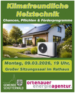 Die Gemeinde Schutterwald und die Ortenauer Energieagentur laden alle Bürger: innen herzlich zur Informationsveranstaltung „Klimafreundliche Heiztechnik – Chancen, Pflichten & Förderprogramme“ ein.