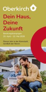 „Dein Haus, Deine Zukunft“ ist eine Kampagne zur Energieeinsparung und Heizungserneuerung in Wohngebäuden in Oberkirch. Vom 20. April bis 22. Mai 2026 finden wöchentlich spannende Info-Abende zu den Themen Sanierung, Heizungstausch, erneuerbare Energien und Energiesparen statt. In diesem Zeitraum übernimmt die Stadt Oberkirch für Einwohner:innen von Haslach, Ringelbach, Stadelhofen und Tiergarten den anfallenden Eigenanteil für Vor-Ort-Termine mit Energieberatern der Ortenauer Energieagentur. Ergreifen Sie die Chance, sich kostenfrei und unabhängig von qualifizierten Energieberatern informieren und beraten zu lassen!